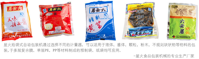 六必居的酱菜所以出名,与它选料精细、制作严格分不开。六必居酱菜的原料,都有固定的产地。六必居有十二种传统产品,它们是:甜酱黑菜、甜酱八宝菜、甜酱八宝瓜、甜酱黄瓜、甜酱甜露、甜酱姜芽、甜酱什香菜、甜酱小酱萝卜、甜酱瓜、白糖蒜、稀黄酱、铺淋酱油。这些产品色泽鲜亮,酱味浓郁,脆嫩清香,咸甜适度。现在,不少传统名牌酱菜,还制成罐头,远销国外。六必居也是星火北京食品亚虎网页机械的主要客户之一,给袋式自动亚虎网页机用于干黄酱、甜面酱、麻辣花生、特味脆鲜瓜、雪菜的亚虎网页。亚虎网页产品如下图: