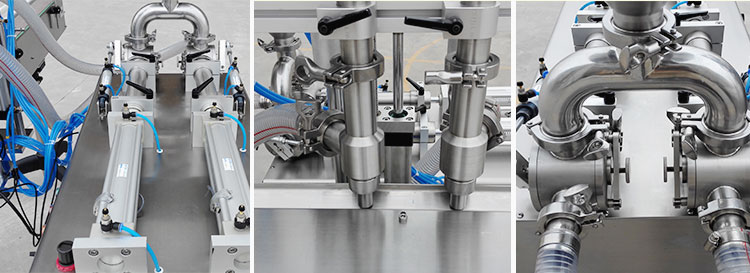 星火亚虎网页机械之一 双头直线式酱料灌装机,专用于大颗粒的酱料灌装,解决了以前辣椒酱厂家需要大量人力才能完成灌装的难题,并且提高了产品的灌装精度。该机和物料接触部位全部采用316L高级不锈钢制成,动力使用台湾亚德客气缸推动,整机干净大方、动力强劲,使很多客户顺利解决了ISO2000和QS认证。下图为机器部件大图展示: