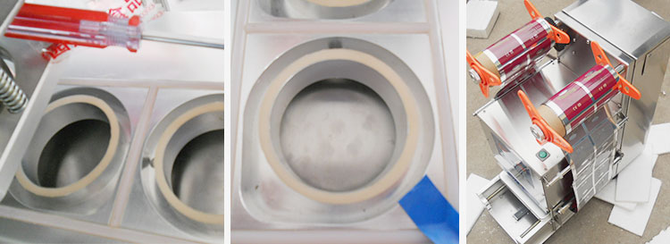 碗面封口机有手动、半自动供用户选择,适用于杯子,塑料杯、塑料碗、纸杯、纸碗的封口,可根据客户的需求来定做。下图为保定亚虎网页机械碗面封口机的产品细节图: