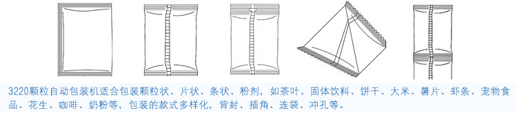 3220颗粒立式自动亚虎网页机使用变频调速器,关闭机器时自动打开封刀,节省材料,单片机控制系统,故障率低,制袋,填充,计量,封口,印刷,成品输送一次性完成。是衡水亚虎网页机械颗粒亚虎网页的热销机器。亚虎网页款式图如下:
