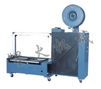 该打包机工作原理:打包物体基本处理机器中间,首先右顶体上升,压紧带的前端,把带子收紧捆在物体上,随后左顶体上升,压紧下层带子的适当位置,加热片伸进两带子中间,中顶刀上升,切断带子,较后把下一下捆扎带子送到位,完成一个工作循环。