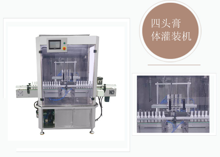 四头全自动膏体灌装机,是星火机械为填补市场空白,专业开发的针对粘稠类物料的自动化灌装封口设备,它采用活塞定量,集机电、气动于一体,电器和气动元件选用世界知名品牌,由PLC控制,设计合理,结构紧凑,外形美观,具有性能稳定可靠、灌装精度高、适应性强、操作简单、维护方便等特点。适用于各种圆形、异形瓶的灌装。广泛应用于制药、日化、化工和食品等行业如含果肉饮料、蜂蜜、糖浆、果酱、花生酱、软膏、化妆品、胶水及各类膏状物。