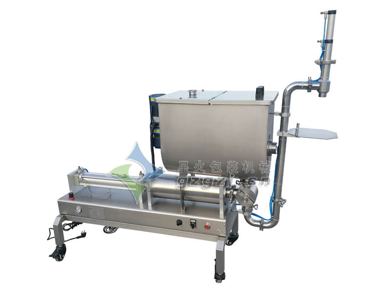 配线颗粒酱料灌装机 ,该机为单头卧式搅拌,是星火公司专门针对粘稠并带有颗粒且浓度较大的酱状物料灌装而设计的,如豆豉酱、黄豆酱、豆辨酱、鲜辣酱等。结构简单、操作方便,配置卧式搅拌,很好的解决了油料分离这个酱料灌装的行业难题。