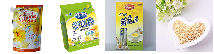 菊花晶是以优质菊花经科学提炼成膏后,配白糖粉等加工制作而成。适用于兑在牛奶中饮用,也可作清凉饮料饮用;该产品营养丰富,既价廉物美,又饮用方便,药食两用。现代科学已能提取菊花中的有效成份,制成菊花晶、菊花可乐等饮品,让喜爱快捷省时的人饮用起来更为方便。炎炎夏季,菊花晶更是消暑降火的优良饮品。炎炎的夏日也是我们星火的菊花晶给袋式颗粒自动亚虎网页机也是为了亚虎网页菊花晶更方便快捷而存在的。